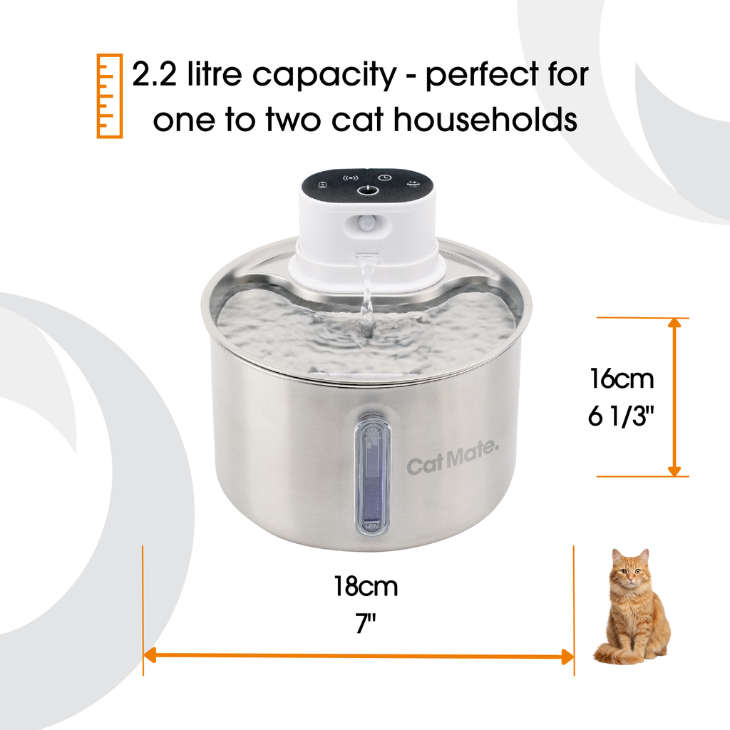 The Cat Mate 2.2 Litre Stainless Steel Fountain is designed around one simple truth: cats are picky about their water—and rightly so. With 24/7 fresh, filtered water and intelligent motion-sensing technology, this compact cordless fountain gives your cat exactly what they need, exactly where they want it. Food-grade stainless steel means pure, clean hydration with no plastic taste, no toxins, and no compromise.